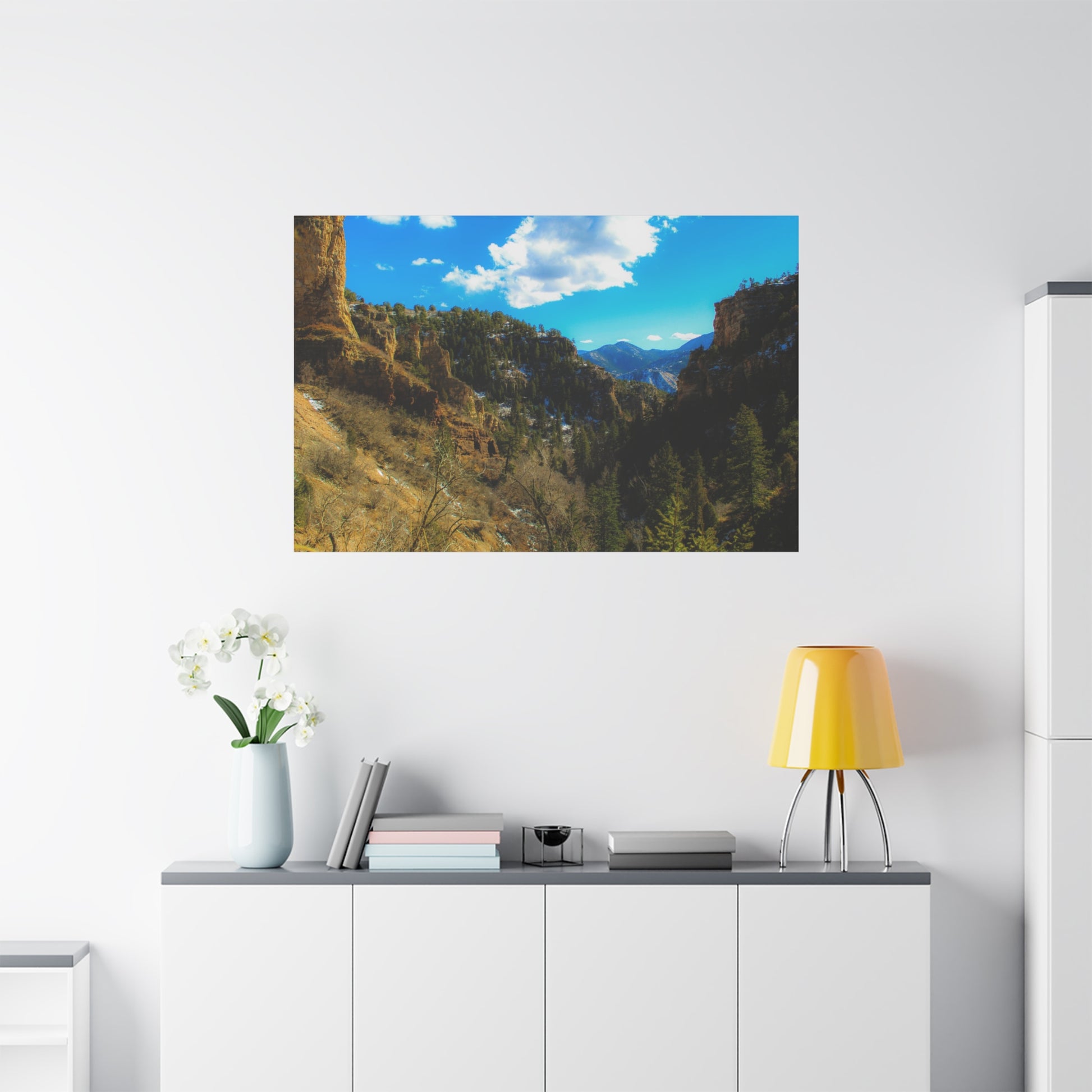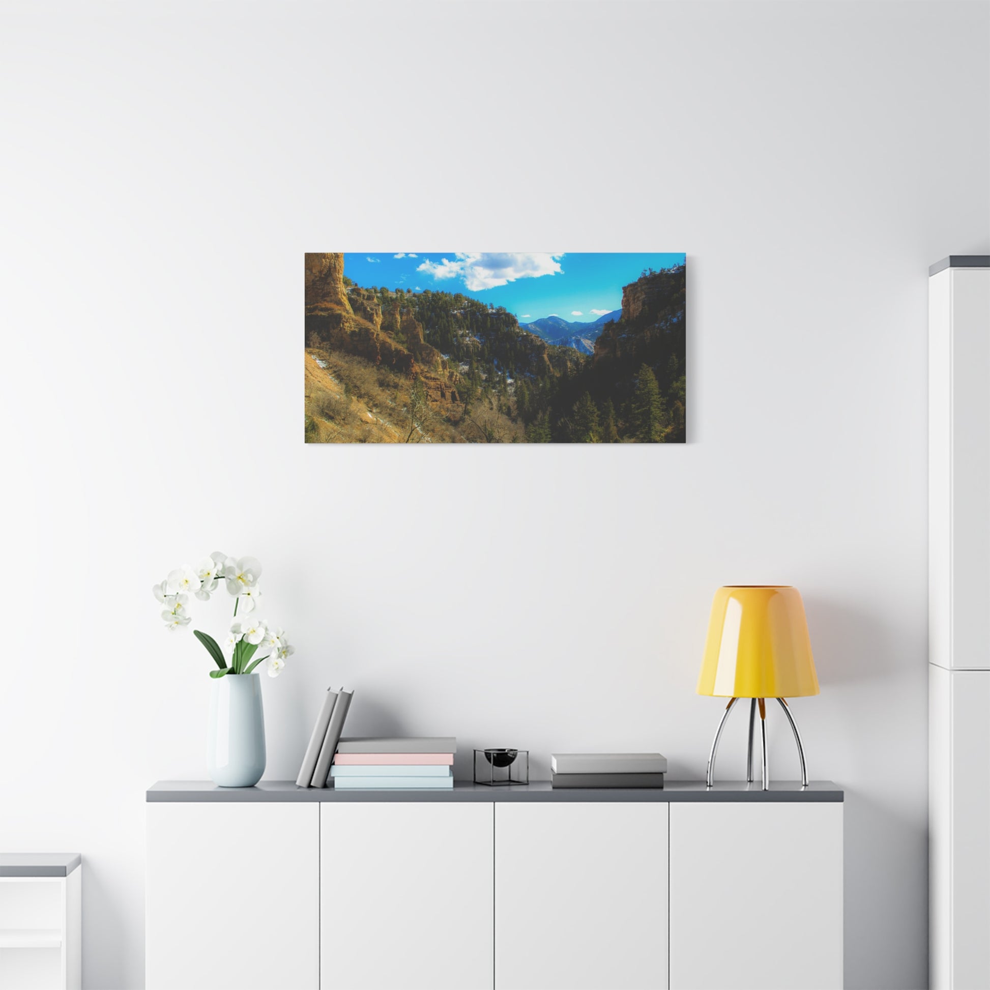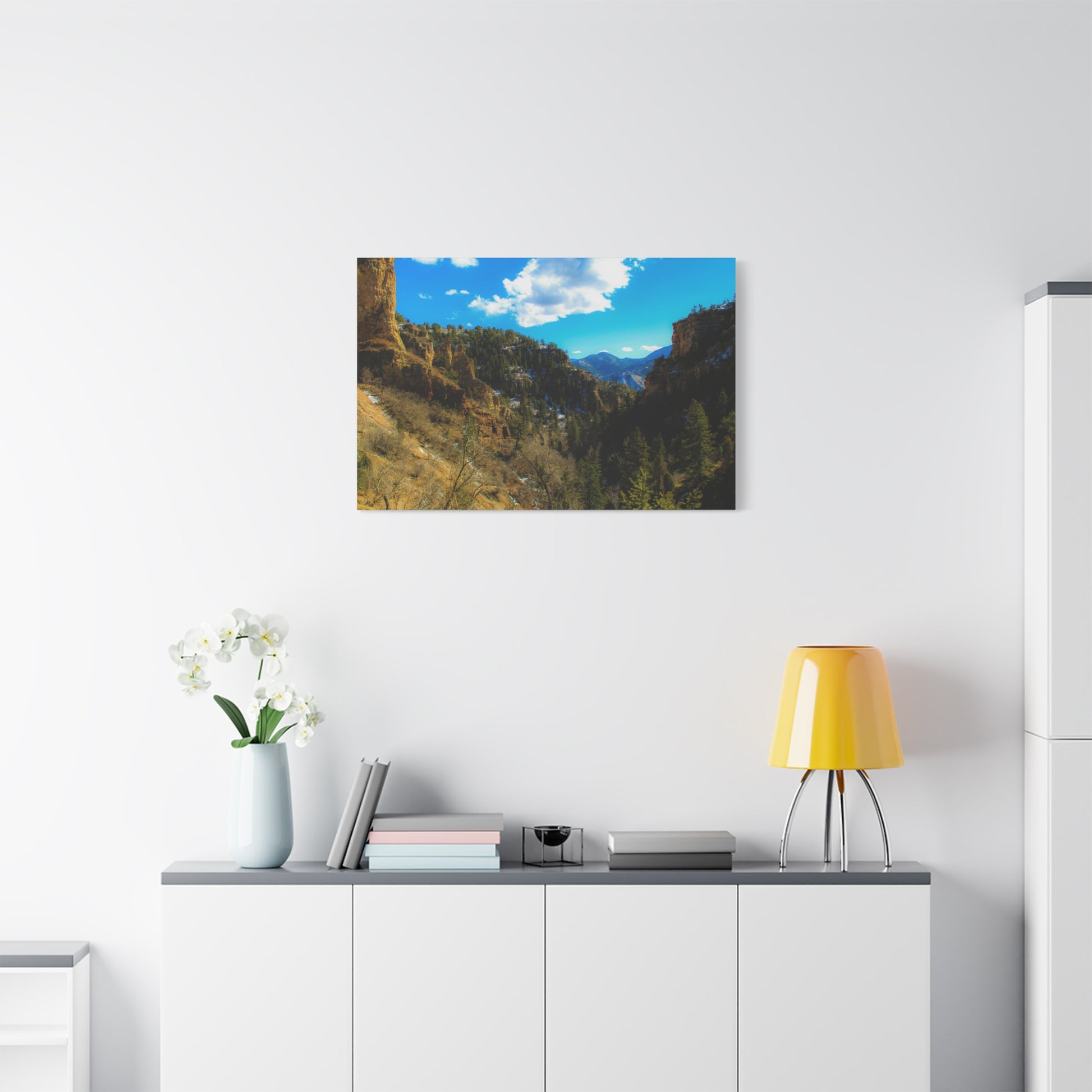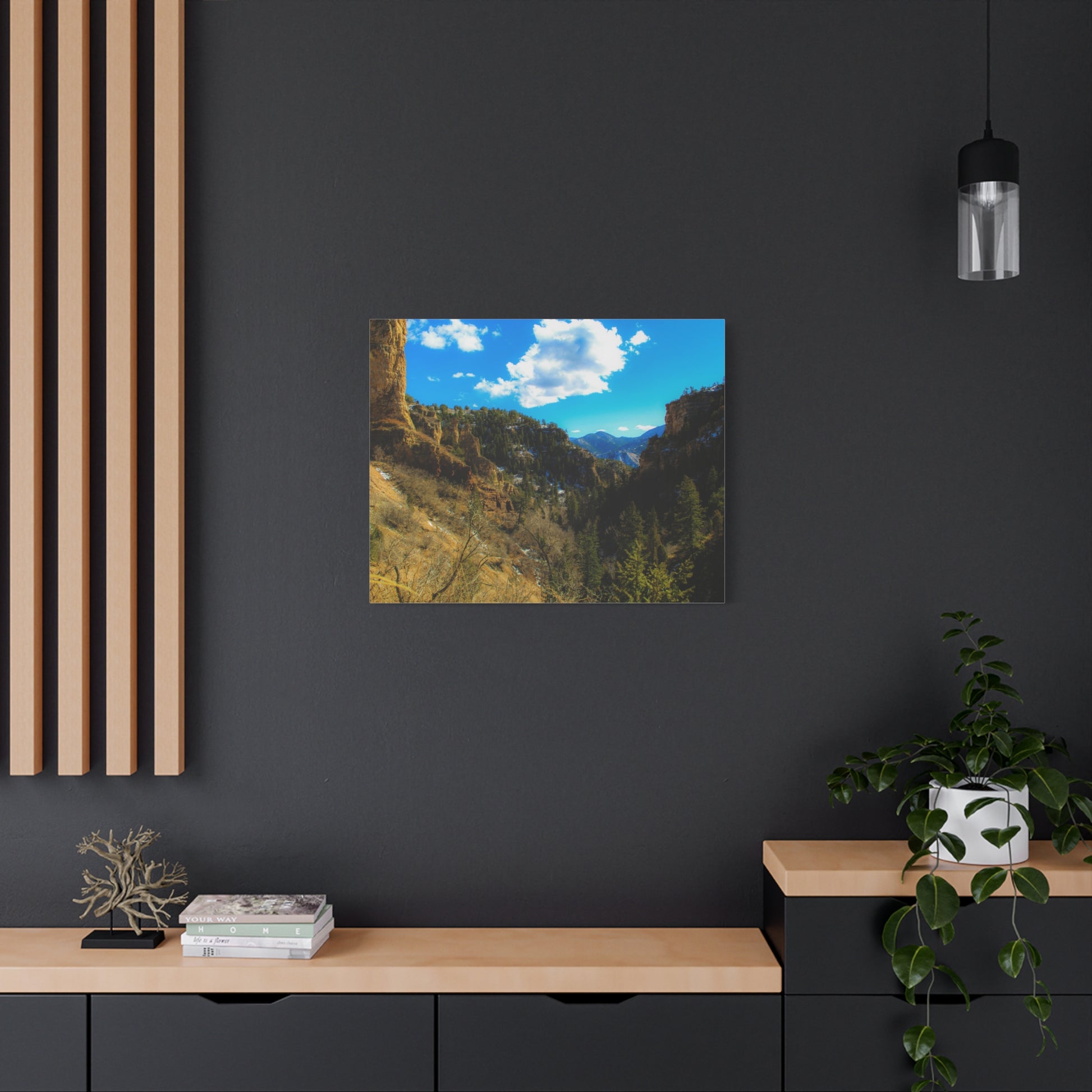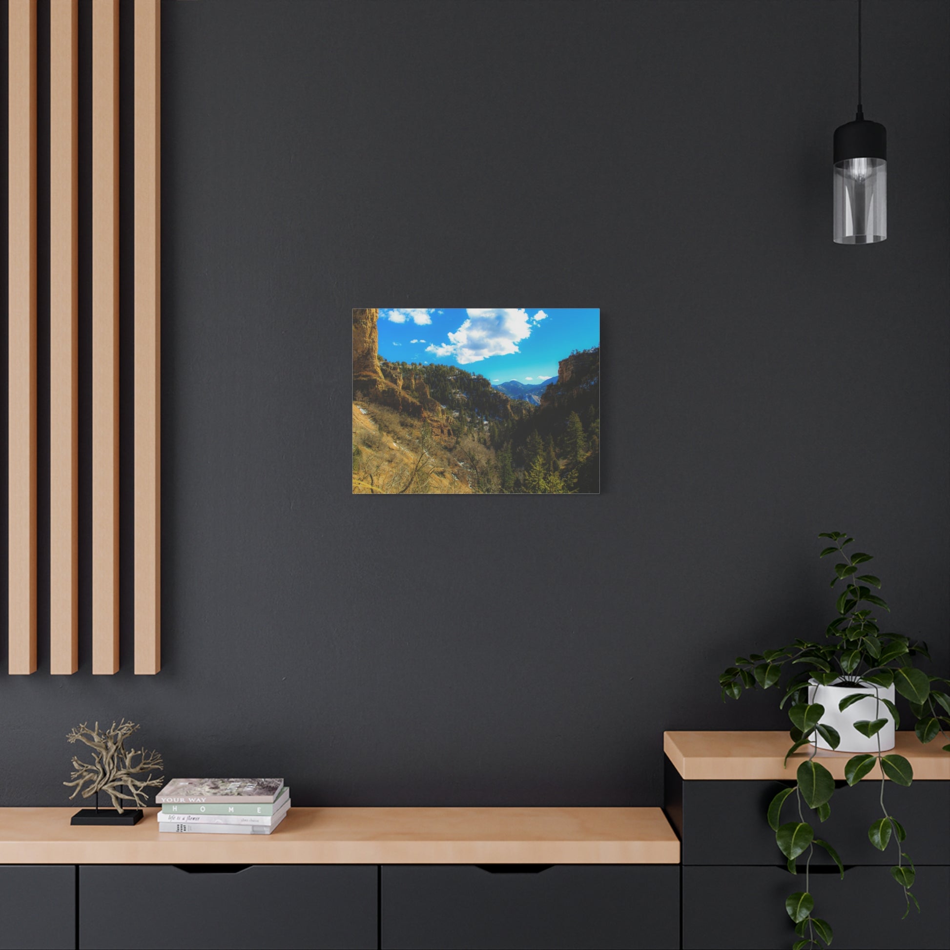 Bring the peaceful atmosphere of a valley with trees and a blue sky into your home with this matte canvas print. Perfect for nature lovers and those who appreciate simple beauty. Ideal for decorating a living room, bedroom, or office. Great for nature-themed home decor, Earth Day, or as a gift for outdoor enthusiasts.