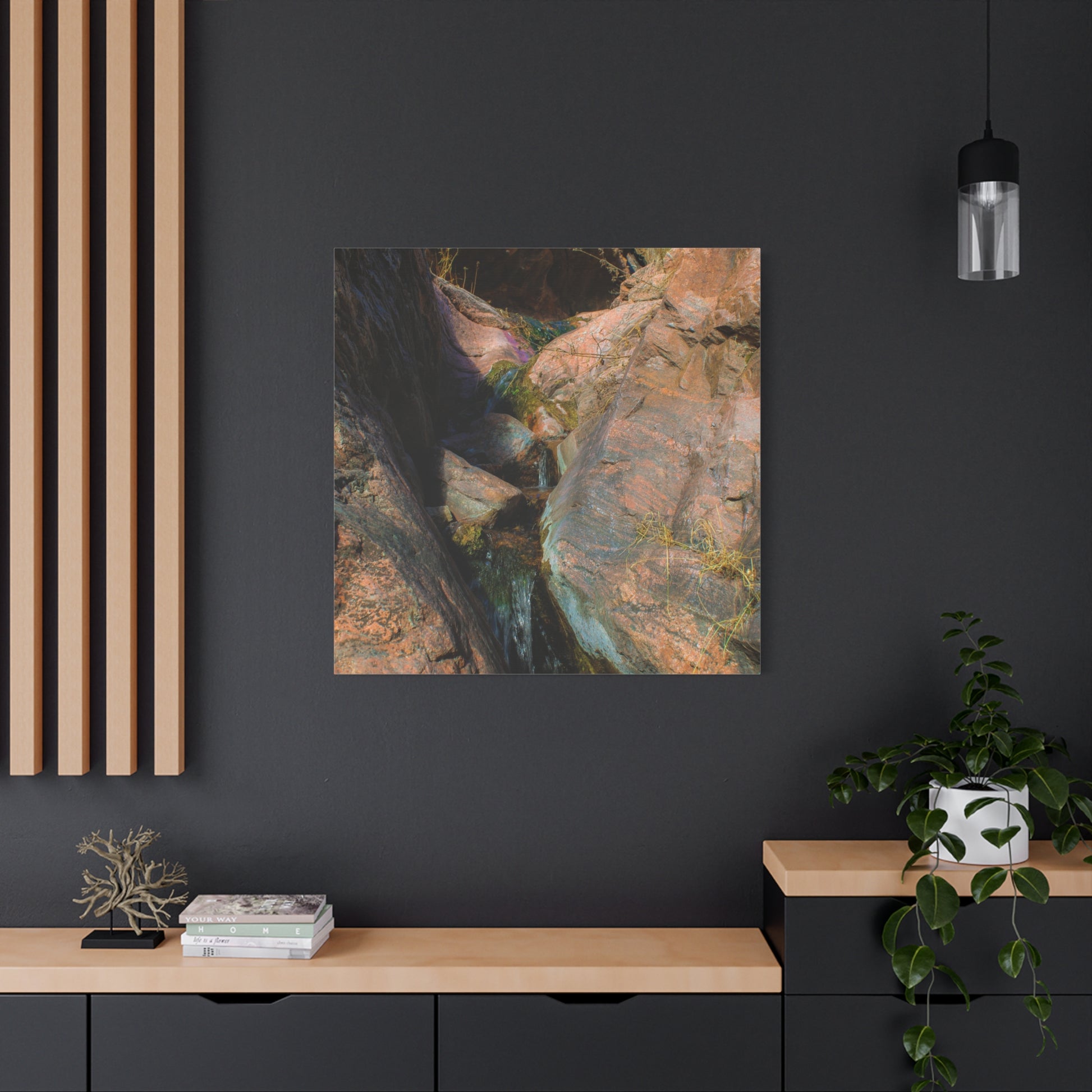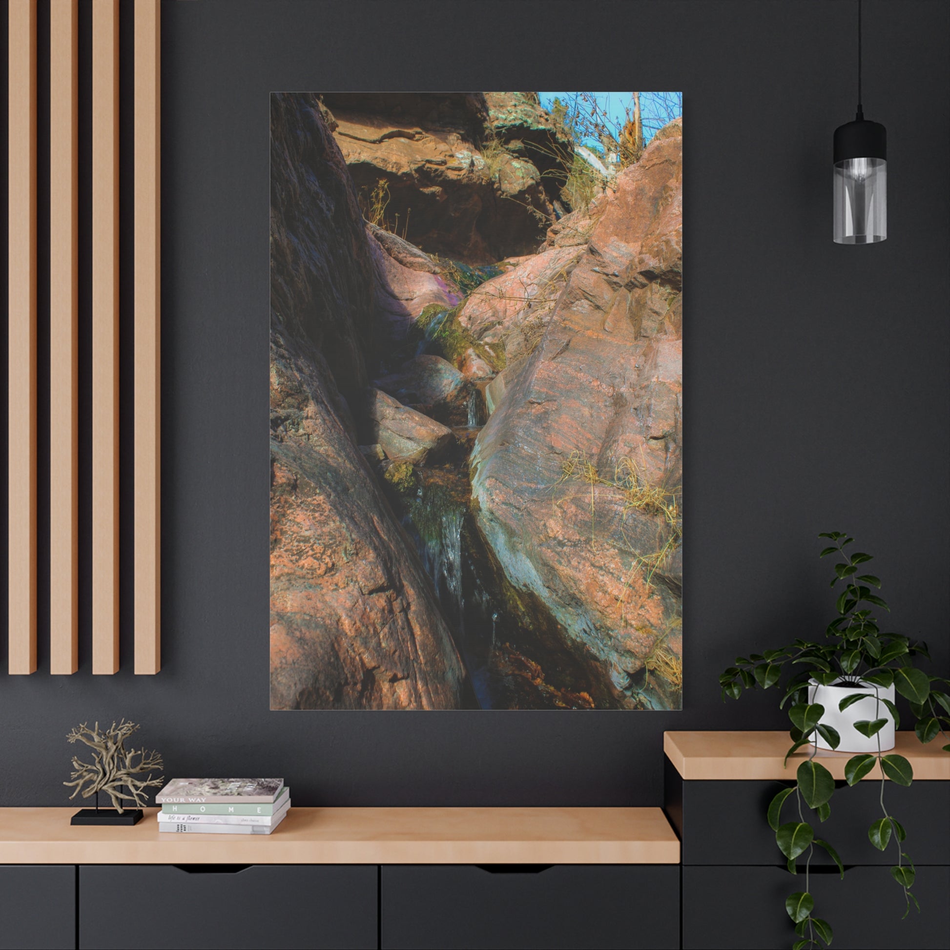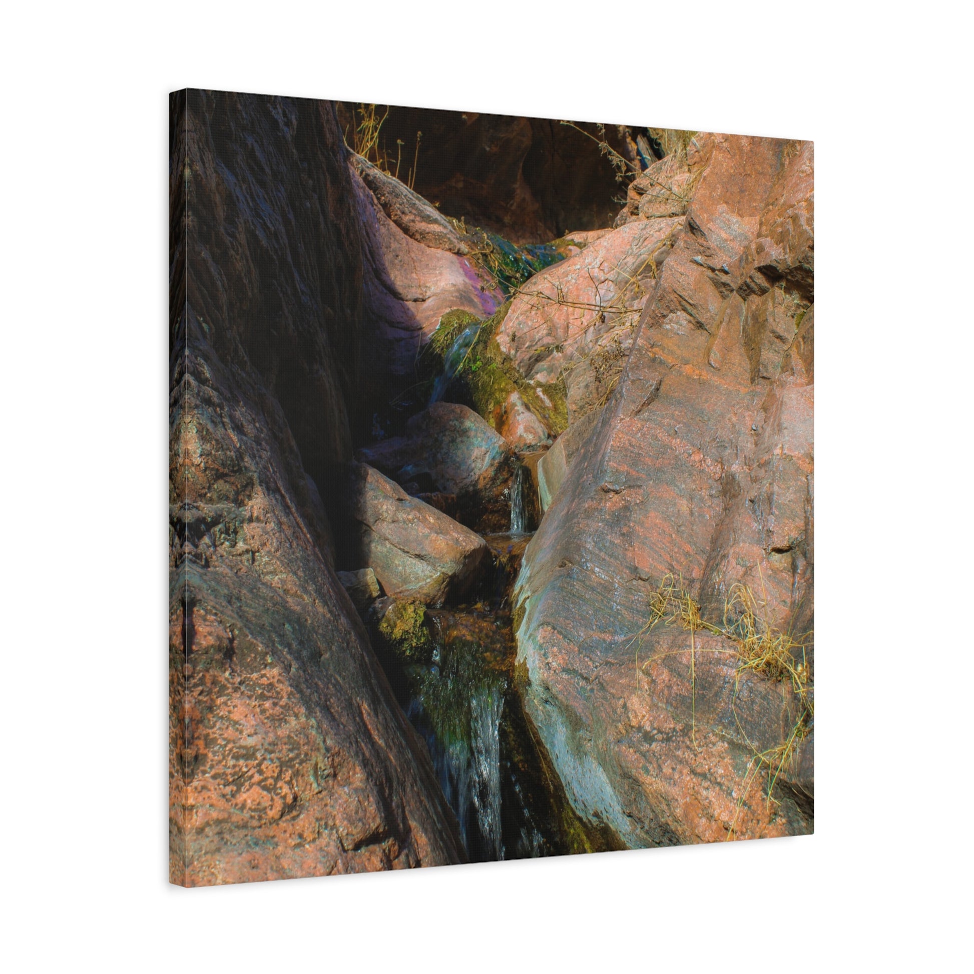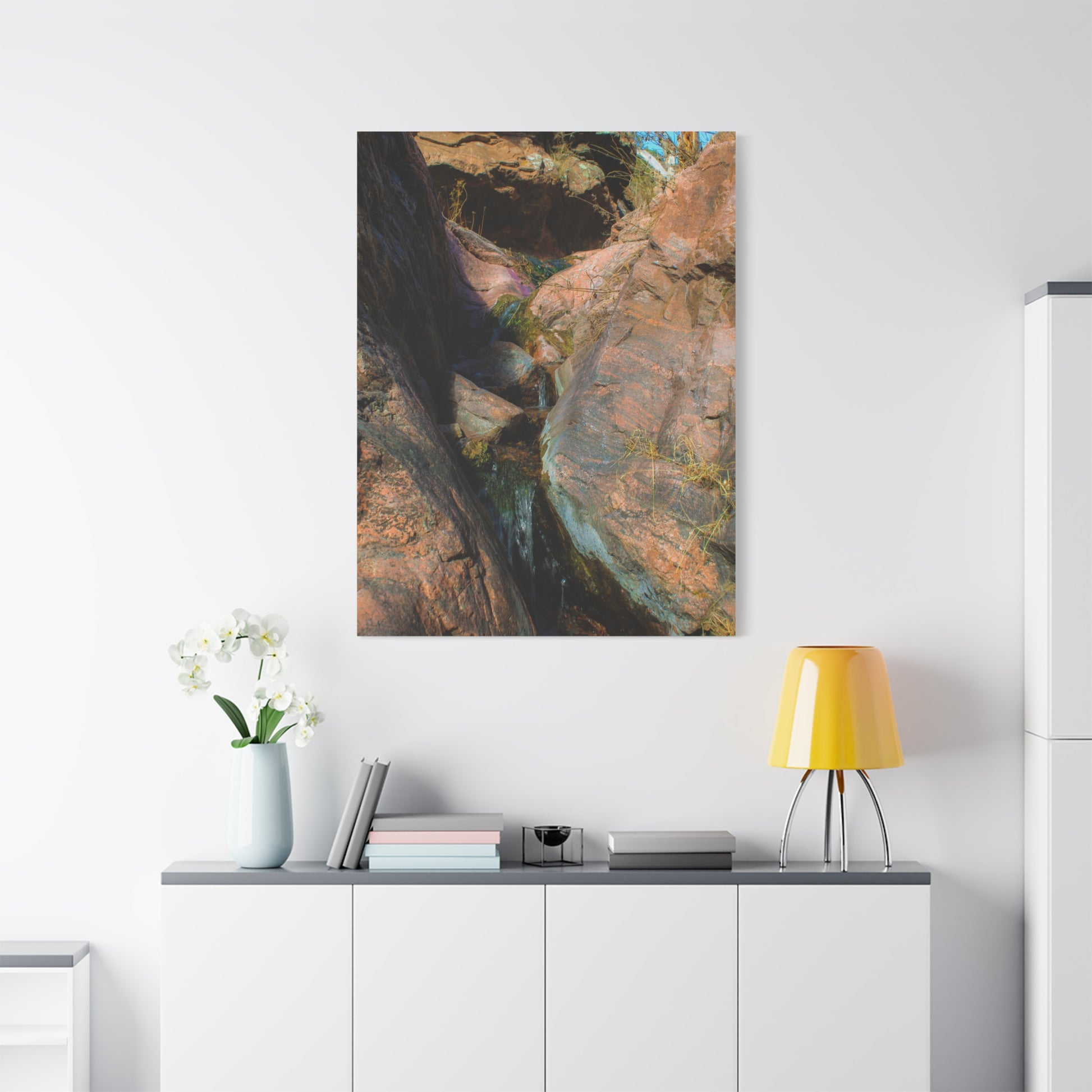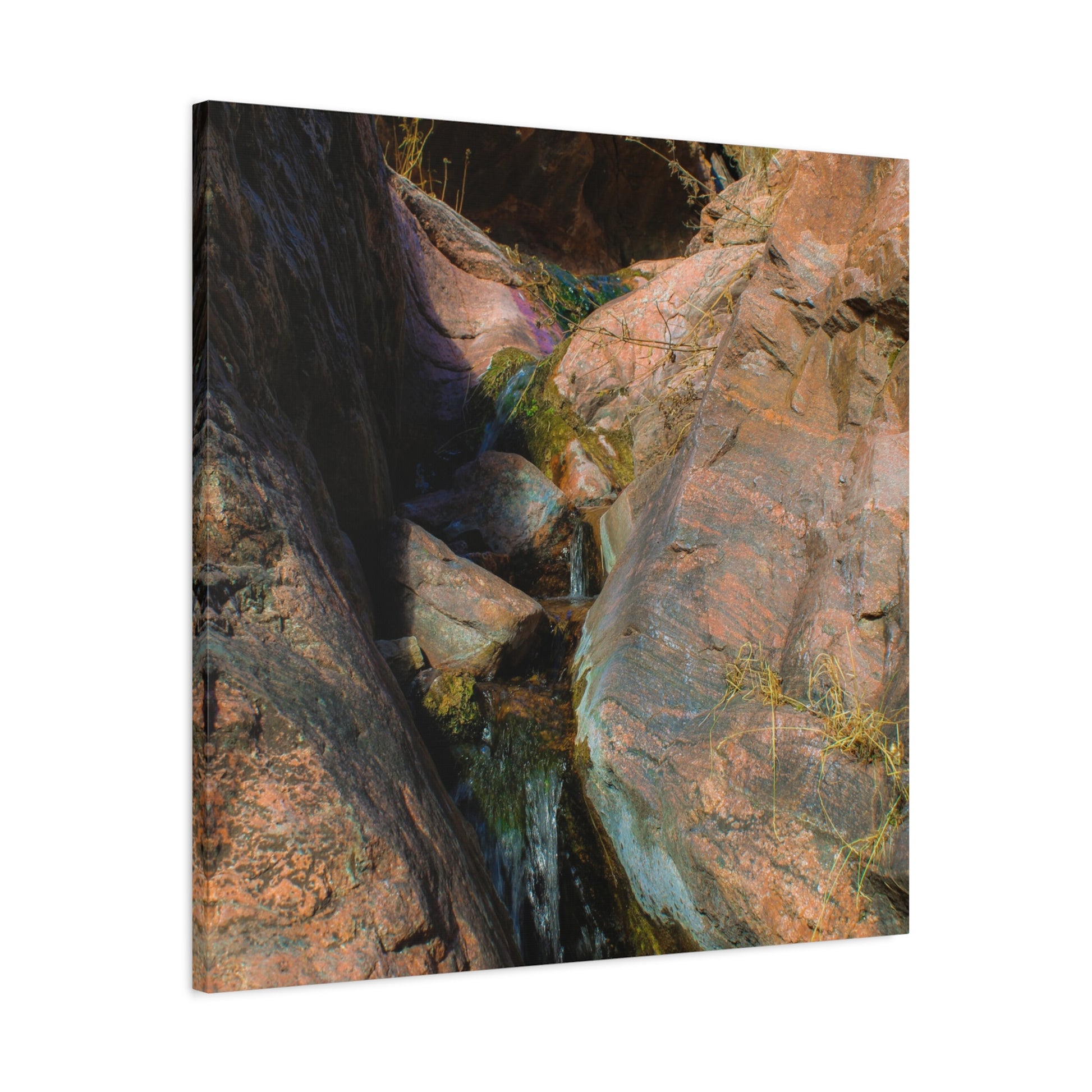 A small waterfall design printed on a matte canvas, stretched on a 1 25" frame. This canvas print exudes a sense of tranquility and nature, perfect for adding a calming touch to any room. Ideal for nature lovers and those seeking a peaceful atmosphere. Great for home decor, gifts for nature enthusiasts, or as a special touch for Earth Day or World Water Day celebrations.