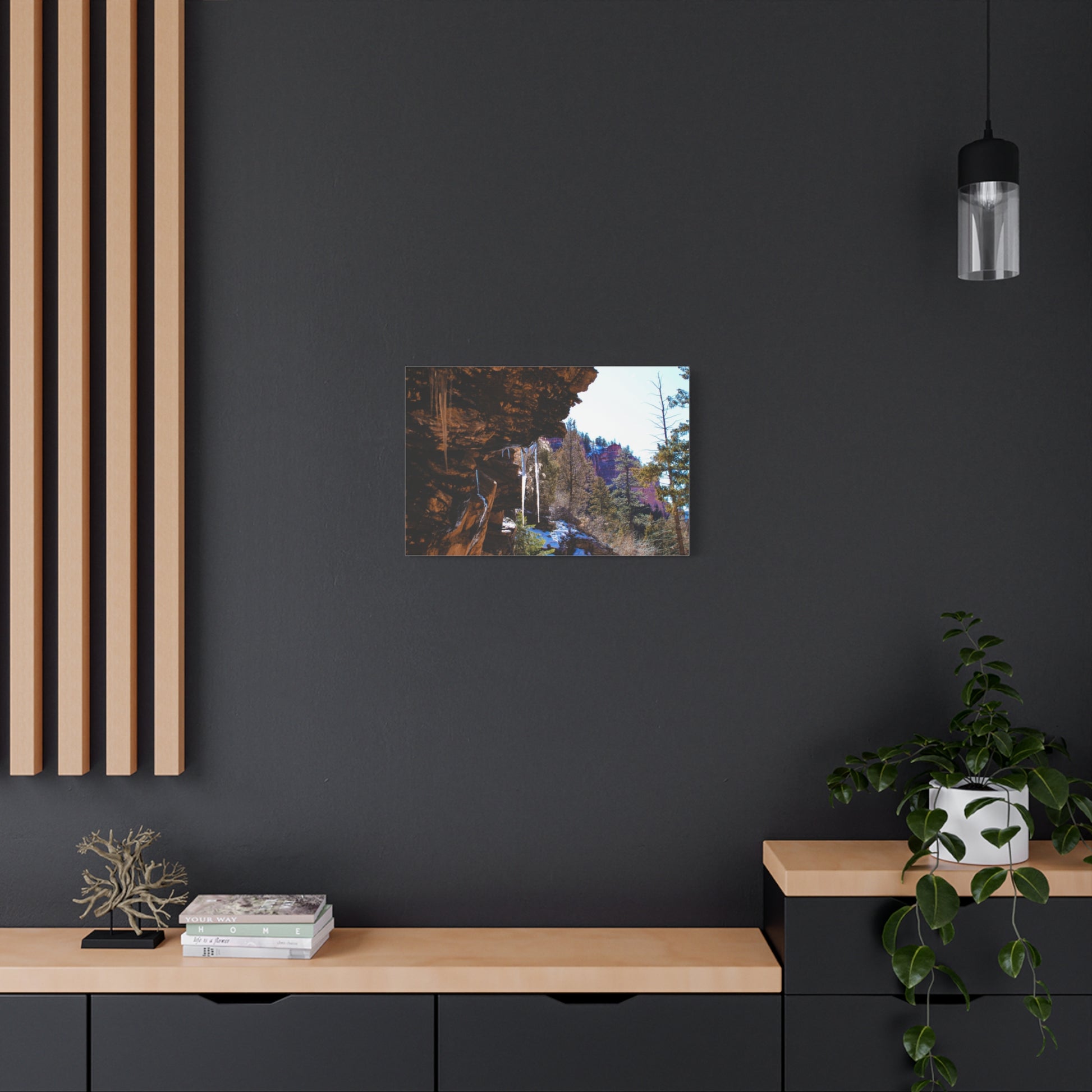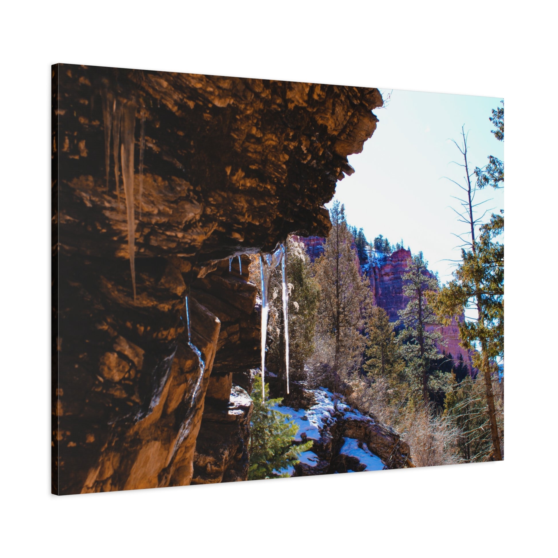 Immerse yourself in the serene beauty of nature with this Mountain Icicles Photography canvas print. Perfect for nature enthusiasts and those who appreciate stunning landscape photography. This print will bring a sense of calm and tranquility to any room, making it ideal for a cozy living room or peaceful bedroom. Ideal for nature lovers, outdoor enthusiasts, and anyone who enjoys the beauty of winter landscapes. Perfect for decorating during the winter season or as a thoughtful gift for nature lovers during the holidays.